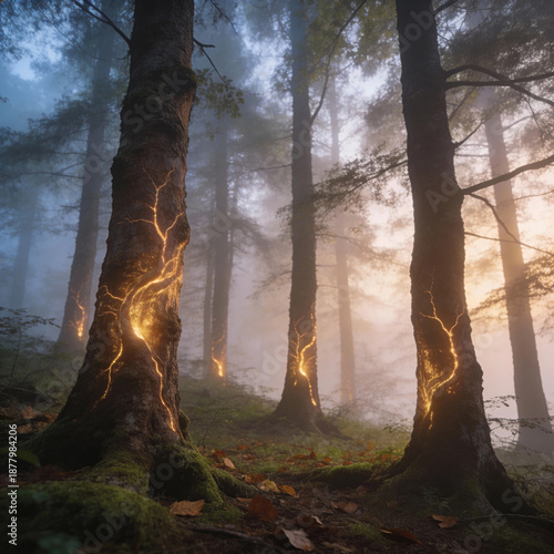 Obraz premium Mystical Fantasy Forest with Glowing Energy Veins in Trees