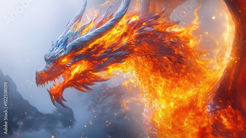Fototapeta premium Mystical fire dragon with vivid fiery patterns, intense heat emanating,