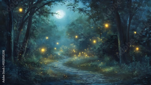 © Siriroj, Obraz premium Mystical Fireflies Floating in Moonlit Forest Landscape
