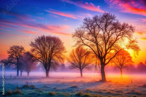 Fototapeta premium Mystical Foggy Autumn Morning with Bare Trees - Eerie Halloween Landscape...