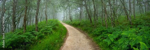 Fototapeta premium Mystical Foggy Forest - A Panoramic View of Oak Trees and a Hiking Trail