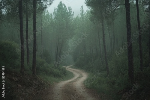 Obraz premium Mystical Foggy Forest Path: A Serene Nature Escape