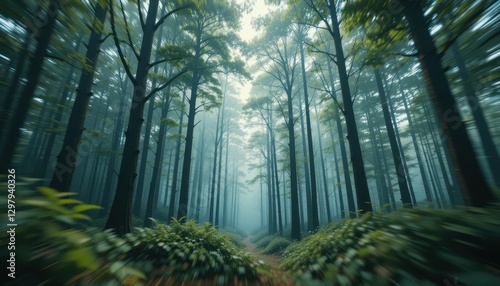 © Ai DreamscapesTH, Fototapeta premium Mystical Foggy Forest Path Green Trees Nature Scene Tranquil Walkway Lush Greenery