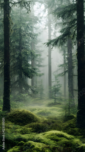 Obraz premium Mystical Foggy Forest with Lush Green Moss Layers