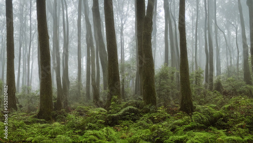 Obraz premium Mystical, foggy forest with towering trees and a babbling brook