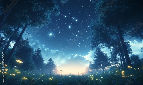 © Yolo, Naklejka premium Mystical forest at twilight with constellations above.