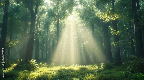 Fototapeta premium Mystical Forest Clearing Sunlight Streams Through Thick Canopy, Creating an...