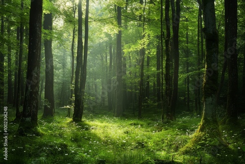 © Елена Григорова, Obraz premium Mystical forest landscape filled with bright flowers and misty light magical woodland.