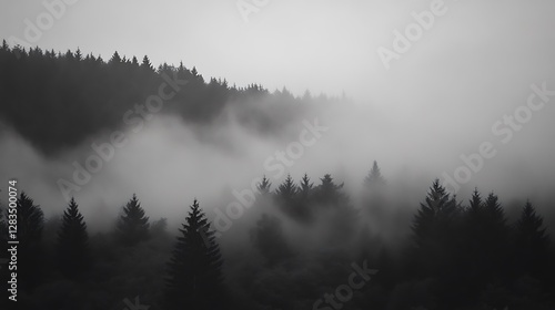 Fototapeta premium Mystical Forest Landscape with Fog Rolling Through the Evergreen Trees