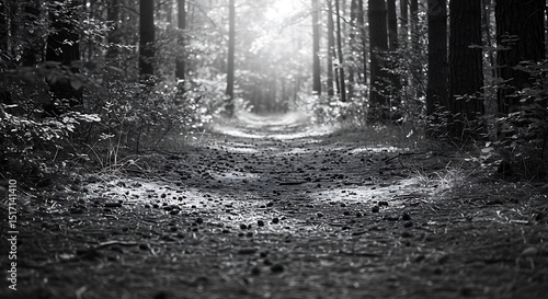 © Syarif, Naklejka premium Mystical Forest Path A Monochrome Journey Through Nature's Embrace