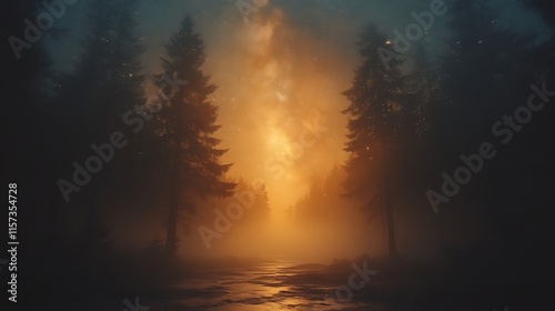 Obraz premium Mystical forest path at twilight, glowing fog.
