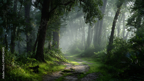 © alexandre, Fototapeta premium Mystical Forest Path Bathed in Ethereal Sunlight