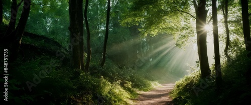 © Wannaeka, Fototapeta premium Mystical forest path bathed in warm dappled sunlight