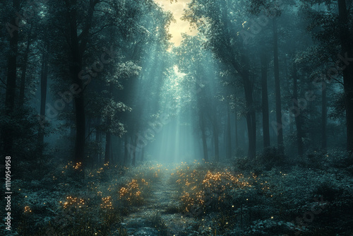 © Myartsam Design, Fototapeta premium Mystical Forest Path Illuminated By Glowing Fireflies