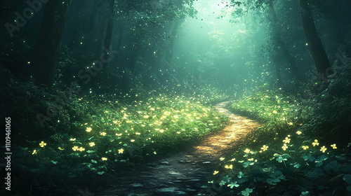 Fototapeta premium Mystical forest path illuminated by soft sunlight and glowing flowers during...