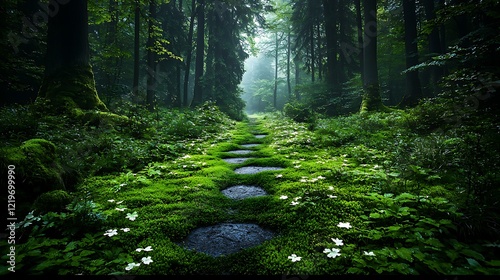 Obraz premium Mystical forest path, mossy stones, morning mist, nature serenity, meditation background