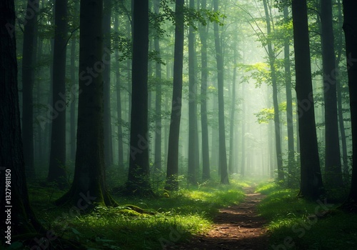 Fototapeta premium Mystical Forest Path: Soft light filters through ancient trees creating a...
