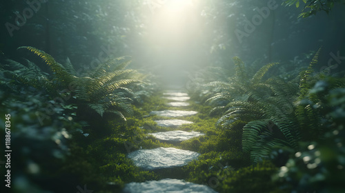 Obraz premium Mystical Forest Path: Sunlight through Fog, Stone Walkway among Lush Green Plants