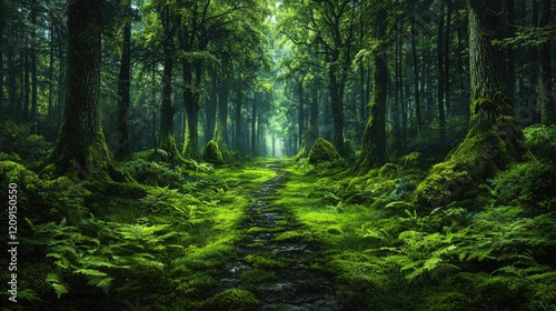 Fototapeta premium Mystical forest path, sunlight through trees, moss, ferns, nature wallpaper