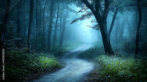 © Ruma, Obraz premium Mystical forest path winding through a misty, twilight wood.