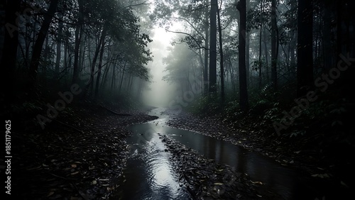 © NeuroVisual Lab, Fototapeta premium Mystical forest path with fog