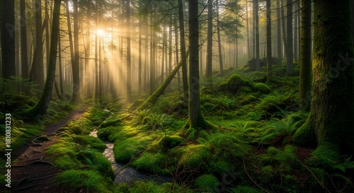 © Narongrit, Fototapeta premium Mystical Forest Path with Golden Sun Rays Piercing Through Fog
