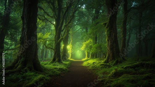 © Andy, Naklejka premium Mystical Forest Pathway Illuminated by Soft Light