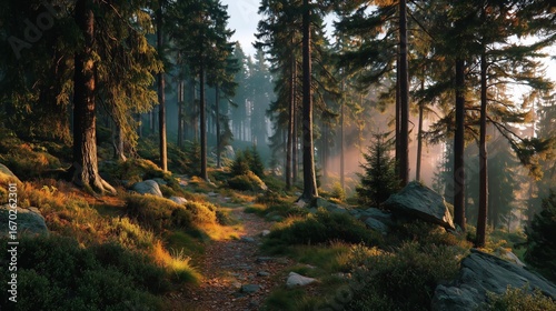 © Khawla, Obraz premium Mystical Forest Pathway Splitting into Two with Golden Morning Light