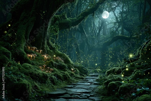 Obraz premium Mystical Forest Pathway Under Moonlight