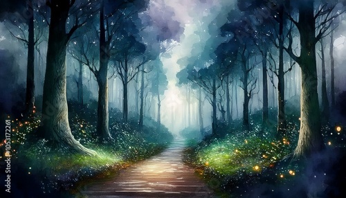 © Uma-Meaw, Obraz premium Mystical forest pathway with glowing lights