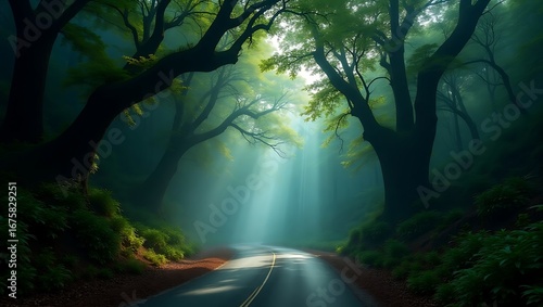 Obraz premium Mystical Forest Road with Sun Rays Breaking Through Canopy A Serene Journey...
