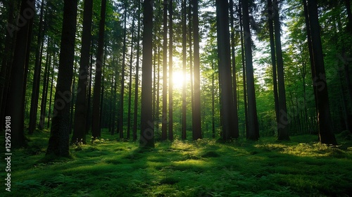 Naklejka premium Mystical forest scene illuminated by sunlight filtering through tall trees...