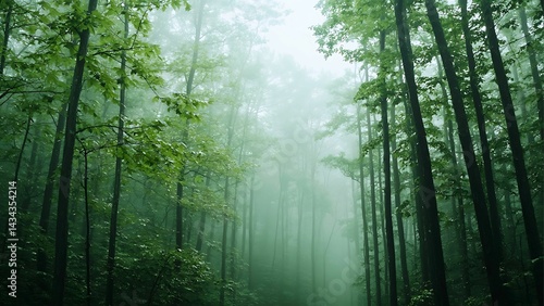 © Beauver, Obraz premium Mystical forest scene with trees enveloped in a soft mist