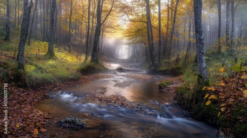 © Nit Nitchalernxai, Obraz premium Mystical Forest Stream in Morning Fog