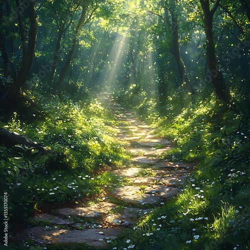 Fototapeta premium Mystical forest sunlight beams green nature path high resolution hd image