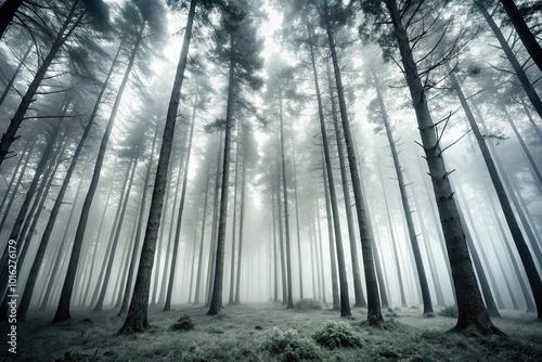 Naklejka premium mystical forest with misty surroundings and tall trees