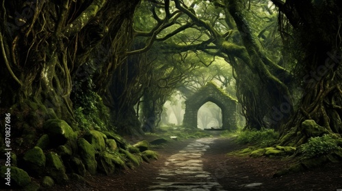 Naklejka premium Mystical forest with moss-covered trees and paths.