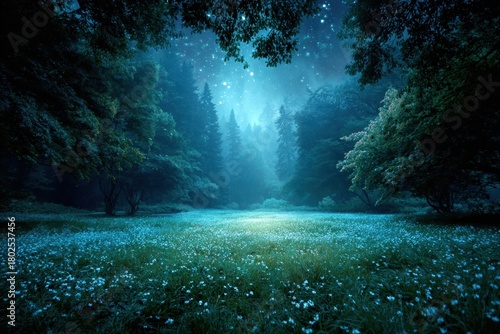 © Alina, Fototapeta premium Mystical forest with sunlight and glowing particles