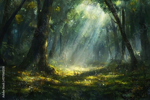 © Md forkan, Fototapeta premium Mystical Forest with Sunlight Streaming Through Tall Trees