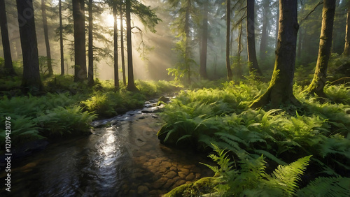 Obraz premium Mystical Forest with Sunrays Piercing the Lush Greenery