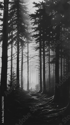 Fototapeta premium Mystical forest with tall pine trees shrouded in dense fog, creating an eerie...