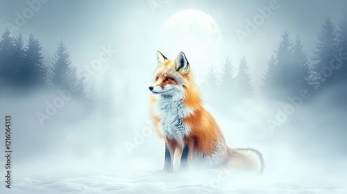 Obraz premium Mystical fox portrait under moonlight, its fur shimmering in cool tones, with a misty forest scene in the background.