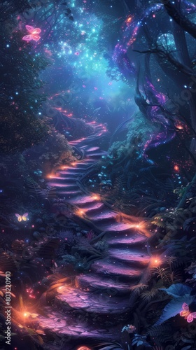 Naklejka premium Mystical Glowing Forest Path with Stairs