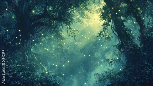 Fototapeta premium Mystical jungle with glowing vines hanging from trees glowing particles...