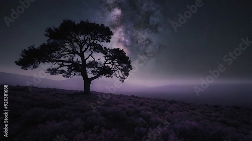 Fototapeta premium Mystical landscape of a forest with a unique lonely tree, dark themed fantasy...