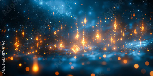 Fototapeta premium Mystical landscape with glowing runes illuminating a quiet cosmic expanse at...