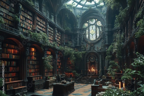 © Tanu, Obraz premium Mystical library filled with ancient books surrounded by lush greenery and soft candlelight during twilight hours