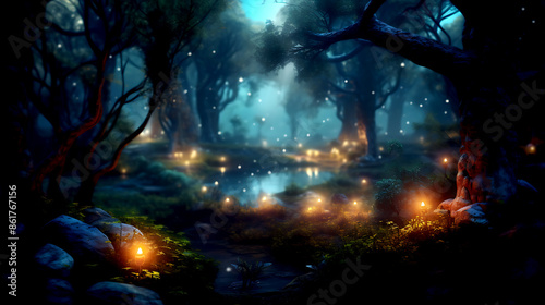 © DesignBee, Naklejka premium Mystical magical forest at night with glowing lights