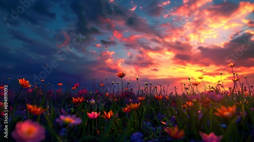 © Beer AI, Obraz premium Mystical meadow where vibrant, glowing flowers bloom under a radiant sky