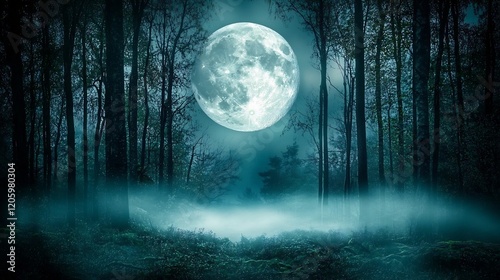 Naklejka premium Mystical Moonlight Illuminates Eerie Forest Scene with Foggy Ground
